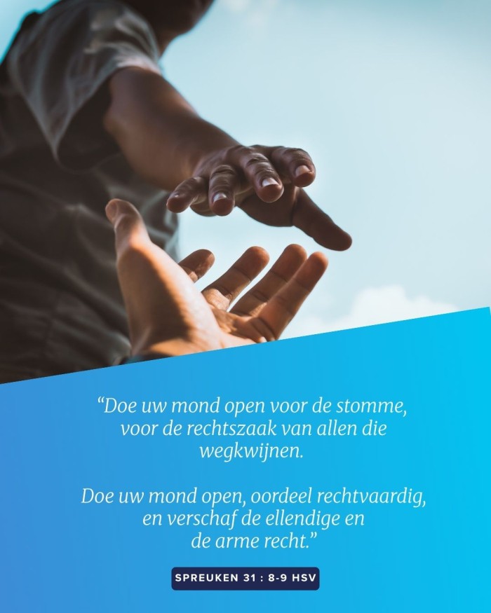 en verschaf de ellendige en de arme recht.” Spreuken 31: 8-9 (HSV)